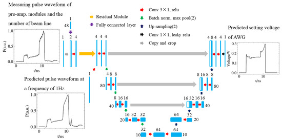 The network input consists of the measuring pulse waveform of pre-amplifier modules and the number of the beam line. The residual module represents the laser system between the measurement position of 1 Hz and the measurement position of pre-amplifier modules, and it outputs the prediction of pulse waveform at a frequency of 1 Hz. The U-shaped module represents the laser system between AWG and the measurement position of 1 Hz, and outputs the prediction of setting the voltage of AWG. The entire process can be simplified by a formula as