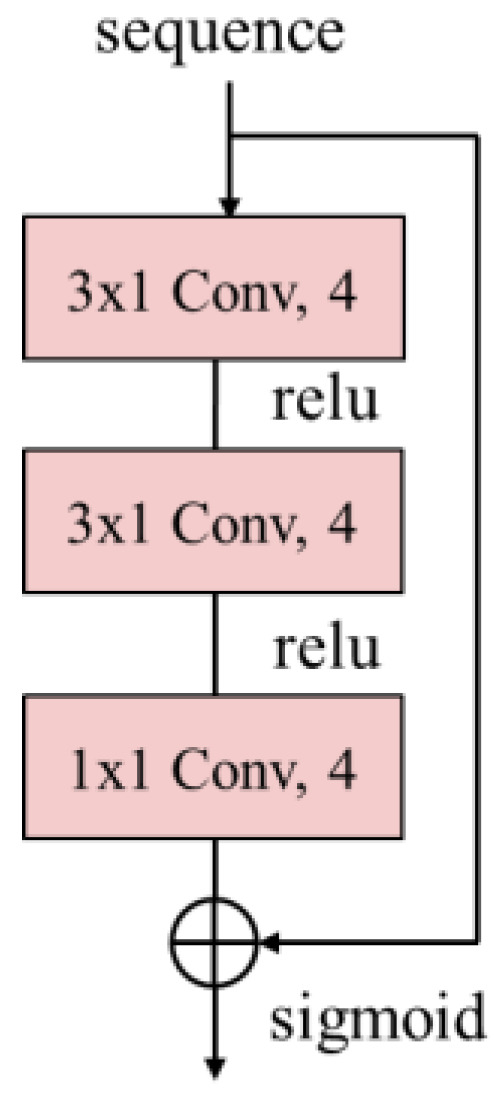 Convolutional layers have sufficient representation ability and filter sharing characteristics, making them the backbone of networks. A schematic diagram of our model for predicting pulse waveforms of a chained front-end laser system is shown in Figure 2. The network is mainly composed of a residual module [19] and a U-shaped module. The structure of the residual module is shown in Figure 3. Two modules are connected in series. The former residual module is the encoder, which performs automatic feature engineering on the input sequence, and then puts its output and other features together. The subsequent fully convolutional network serves as the learner. At the same time, UNet itself also has encoding functions. UNet is based on the encoder–decoder structure. It consists of a contraction path to capture context and a symmetric expanding path that supports precise localization. The network mainly consists of four major operations, convolution, up-convolution, max-pooling, and feature forwarding. Convolutional operations use receptive fields that detect specific attributes such as lines and edges. As the layers go deeper, more complex attributes can be detected. An up-convolution is a transposed matrix operation on positive convolution, which maps the detected attributes back into the sequence space. Inserted pooling layers between the successive convolutional layers reduce the amount of parameters and computational cost. The high-resolution features from the left contracting path are forwarded to the expanding path by combining with the up-sampled output. We adjust kernel size, the number of convolutional kernels, and other hyper-parameters of the network based on the original architecture to make it more suitable for our task.