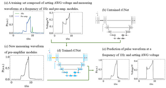 Figure 4 shows the overall architecture of our method to train the network for filling in paired missing values in the database of pulse waveform. Raw data of pulse waveform are taken from the monitoring system of a large laser facility. The training set consists of a pair of pre-amplified repeat AWG sequence data. Figure 4b shows the unfitted rUNet model with an untrained parameter. The structure of the model is shown in Section 2.2. We used the training set (Figure 4a) to train the model to learn the inverse calculation process of the pulse waveform from the pre-amplifier modules to the AWG. In order to test whether the model can make accurate predictions for the new measurement of pulse waveform of pre-amplifier modules, we used the trained rUNet (Figure 4d) to perform inverse calculations on new data. Therefore, the input of the trained rUNet is a new measurement pulse waveform of pre-amplifier modules and the corresponding number of the beam line. The output (Figure 4e) is the pulse waveform at a frequency of 1 Hz and the setting voltage of AWG predicted by the network.