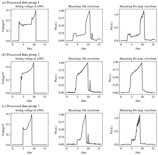 Processed data groups of pulse waveforms. The left column is setting the voltage of AWG. The middle column is measuring the pulse waveforms at a frequency of 1 Hz. The right column is measuring the pulse waveforms of pre-amplifier modules.