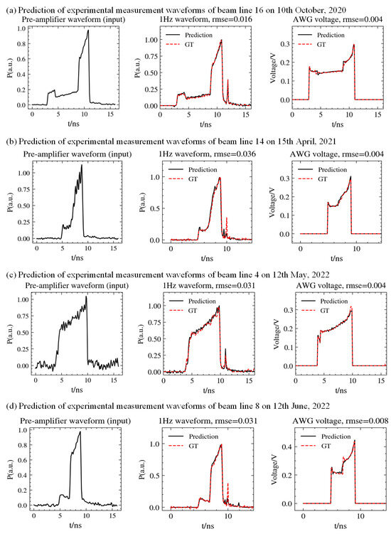 To test the robustness and adaptability of our network for predicting the pulse waveform of a front-end laser system according to a new input, we collected more recent pulse waveforms, which are not in the training set, from different beamlines, and prepared the testing set following the same method as was used to produce the training set. The measurements of pulse waveforms of pre-amplifier modules were processed into a sequence with a length of 160 and fed as an input into the trained rUNet together with the corresponding number of the beam line. Then, the prediction results of the model were compared with the ground truth. The total number of testing samples was 1509. The trained network achieved an RMSE of 3.38% on the testing set of measuring pulse waveform at a frequency of 1 Hz, and an RMSE of 0.84% on the testing set of setting the voltage of AWG [21]. Figure 6 shows a comparison between the predicted pulse waveform and the real measured pulse waveform. As shown in Figure 7, the trained model can accurately predict the pulse waveform at a frequency of 1 Hz and set the voltage of the AWG.