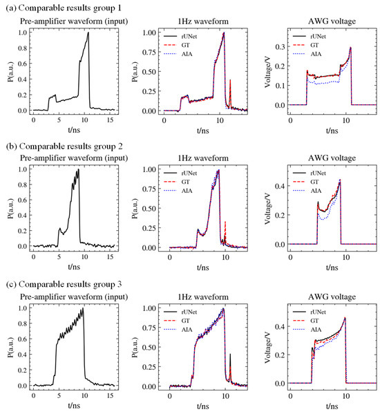 The closed-loop control method used for pulse shaping on a current high-power laser facility is an artificial intelligence-assisted (AIA) method, as described in detail in reference [14]. The core of the AIA method is to assign an initial value to the set voltage of AWG during the closed-loop process through a trained UNet. We quantitatively compare the average prediction performance and accuracy of our proposed method with the AIA method. The prediction results of the proposed prediction model and the AIA method are compared to the measurement data in experiments, as shown in Figure 8. And, the specific performances of the two methods are shown in Table 2.