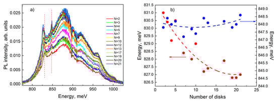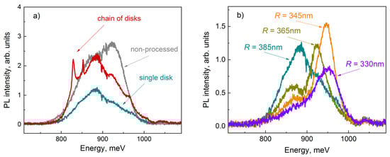 The gap between the narrow peaks depended on the number of disks in the chain, it increased with N (Figure 4). At N = 2, the gap between peaks is smallest and consists of ≈17 meV (E1 ≈ 831 meV and E2 ≈ 848 meV). By increasing the number of disks, the narrower peak was practically unchanged in its position, while the broader peak slightly shifted (by ~4 meV) to longer wavelengths. Also, the dependence of the PL peak position on the radius of the disks was observed. The PL spectra at the period of the chain a = 1 µm (Figure 3a) showed the blueshift of narrow peaks with decreasing radius.
