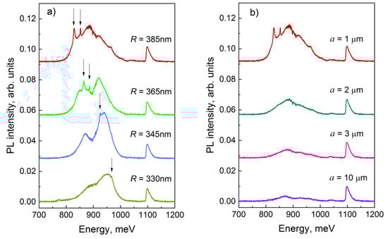 (a) Micro-PL spectra in dependence on the disk radius R at fixed period of a chain, a = 1 µm. The arrows indicate the positions of narrow peaks. (b) Micro-PL spectra depending on the period of the chain at fixed radius R = 385 nm. The number of disks in the chain N = 51.