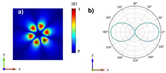 (a) The near field distribution, calculated for the Mie mode with an orbital angular momentum m = 3 in a single Si resonator positioned on the SiO2 layer. (b) The cross-section of the far field radiation pattern for this mode, calculated without SiO2 layer, in the homogeneous medium approximation. The radius of disks was 385 nm. The refractive index and the extinction coefficient of silicon and SiO2 were taken according to [54,55].