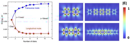At the second step, we studied the modes of linear chains with different numbers of resonators. Special attention is paid to the evolution of the MO mode. Already at N = 2 the mode splitting occurs and two collective modes were formed (Figure 6). One of the modes, with larger electric field amplitude in the gap between disks, shifted downward in energy scale, while the other shifted upward. In the following, we will refer to the former as the “longitudinal” mode (with a spread electric field along the chain) and the latter as the “transverse” mode. By increasing N, the splitting between modes increased and after N = 10 practically did not change. According to the calculation results, with enough long chains (N ≥ 10) the “longitudinal” mode had energy ≈ 822 meV, while the “transverse” mode achieved energy ≈ 841 meV, which is in good agreement with the experiment. The “transverse” mode is characterized by a higher field concentration inside disk than the “longitudinal” one. This corresponds well to the experimentally revealed difference in the quality factor of low- and high-energy peaks (Figure 2a). We would like to point out that the near field configurations of the considered modes (see the wave field pattern in Figure S3) are very similar to configurations of the true BICs found for infinitely long rods and cylinders [56,57,58], namely, the field pattern of our “transverse” mode is similar to one of the symmetry-protected BIC, while the field pattern of the “longitudinal” mode is close to one of the accidental BIC studied in these works.