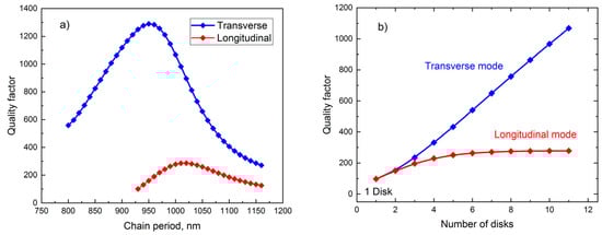 The dependences of quality factors of “transverse” and “longitudinal” modes (a) on the chain period and (b) on the number of Si disks in the chain with period 1 µm. The dependence on the chain period is calculated for N = 11. The radius of disks is 385 nm. The refractive index and extinction coefficient of silicon and SiO2 were taken according to [54,55].