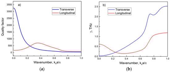 The dependences of quality factors (a) and radiation losses γ = Im[ω(kx)] (b) on the wave vector kx (along the chain line) calculated for the “transverse” and the “longitudinal” modes in the infinite chains of Si disks. The radius of the disks was 385 nm, and the period was 1 µm. Calculations were done without substrate, and the refractive index of the surroundings was taken as n = 1. The refractive index and extinction coefficient of silicon were taken according to [54]. The results of calculations performed for the disk chains positioned on SiO2 substrate are presented in the Supplementary Materials (Figure S6).