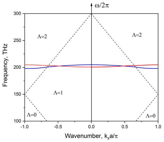 Diagram showing the number of open diffraction channels, Λ, depending on the frequency ω and the wave vector kx. Blue and red curves show the dispersion dependences for the “transverse” and the “longitudinal” modes, respectively, in infinite chains of Si disks. The radius of disks is 385 nm, and the period is 1 µm. The calculations were done without substrate, the refractive index of surroundings was taken as n = 1. The refractive index and extinction coefficient of silicon are taken according to [54].