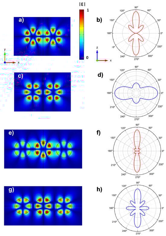 The left panels (a,c,e,g) show the near-field distributions calculated for the “longitudinal” (a,e)” and transverse” (c,g) modes in the model structures corresponding to the experimental chains of resonators with N = 2, 3 positioned on SiO2 layer. The right panels (b,d,f,h) show the corresponding cross-sections of the far-field radiation pattern, calculated without SiO2 layer, in the homogeneous medium approximation. The radius of the disks is 385 nm, and the period of the chains is 1 µm. The refractive index and extinction coefficient of silicon and SiO2 were taken according to [54,55].