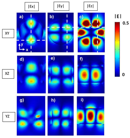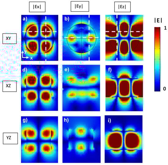 The near-field distributions calculated at λ = 1.506 (E ≈ 823 meV) µm for the infinite chain of resonators with embedded Z-dipoles. The radius of disks was 385 nm, the period of the chain is 1 µm, and the height H = 440 nm. The Z-dipole was placed at a depth of 150 nm from the top plane of the disk. In XY-plane, this dipole was positioned on the Y-axis at a distance 2R/3 from the symmetry axis of the disk. The dashed lines show the positions of the XY- and XZ-sections. The panels (a,d,g) are related to the Ex component. The panels (b,e,h)—Ey component. The panels (c,f,i)—the Ez component. The refractive index and extinction coefficient of silicon and SiO2 were taken according to [54,55].