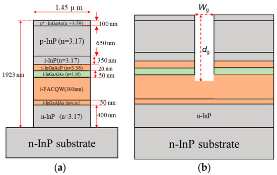 A schematic cross-section of the FACQW-based waveguide is shown in Figure 3a. The waveguide structure is the same as the second-order and fourth-order wavelength-selective switches reported by our research group [23,26]. The waveguide consists of a core layer with 12 periods of InGaAs/InAlAs (i-FACQW in Figure 3a), 50 nm of InAlGaAs, and 20 nm of i-InGaAsP separate confinement heterostructure layers, and a p/n-doped InP cladding layer. The refractive index and thickness of every layer in the waveguide are labeled in Figure 3a. The waveguide is surrounded by benzoncyclobutene (BCB) (refractive index is 1.543 at a wavelength of 1550 nm). The group index of the FACQW waveguide is 3.8. Figure 3b shows the schematic cross-sectional view of the coupling region. The width and depth of the groove in the coupling region are 300 nm and 1.27 μm, respectively. The amplitude transmission for the coupler is 0.96.