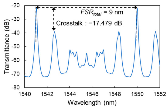 The ratio of m2 to m1 in this study is set at 5 to 6, and the FSRtotal is 9 nm. The round-trip lengths of Rings 1 and 3 are 351.19 μm, which corresponds to the FSR1 of 1.8 nm, and the round-trip lengths of Rings 2 and 4 are 421.36 μm with the FSR2 of 1.5 nm. The designed parameters of the proposed fourth-order Vernier MRR filter are summarized in Table 1. The calculated spectral response of the MRR filter is shown in Figure 4, which exhibits an extended FSRtotal of 9 nm. The difference between the intensity of the main resonance peak and the second-highest resonance peak within the FSR is defined as the crosstalk. The crosstalk of the designed MRR filter is −17.479 dB.