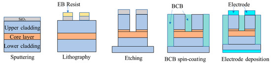 A 2-inch FACQW wafer is fabricated via metal-organic chemical vapor deposition (MOCVD). The wafer will be cut into a chip with a size of 1 × 1 cm2. Since the height of the designed waveguide is approximately 1.923 μm, it takes 4 min to form the waveguides in the process of etching. When Electron Beam (EB) resist is used directly as the mask layer for waveguides, the EB resist will be completely etched, which will result in the waveguide height not reaching 1.923 μm. Because SiO2 has a high etch selectivity ratio in InP etching, SiO2 is adopted as the mask layer for waveguides and grooves forming in this experiment. The main fabrication process is shown in Figure 5. Then, the resist required for exposure is spin-coated on the FACQW wafer, and the wafer is exposed via electron-beam lithography (Advantest F7000, ADVANTEST, Tokyo, Japan). After development, the pattern of the designed MRR filter is transferred to the resist. The remaining resist is used as a mask layer, and the wafer is etched using inductively coupled plasma reactive ion etching (ICP-RIE, Oxford ICP 180, Oxford Instruments, Oxfordshire, England) to form the waveguide and groove. Subsequently, BCB is filled around the waveguide, and metal electrodes are deposited on the top of the MRRs and the bottom of the chip.