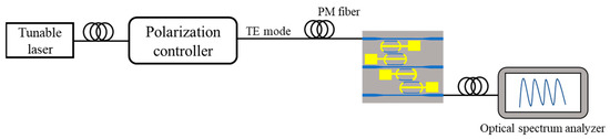 The equipment used in the measurement is an Agilent 816A tunable laser (Agilent, Santa Clara, CA, USA), a THORLABS PAT9000B polarization analyzer, and an Agilent 86082A spectrum analyzer. In the measurement setup, the lightwave signal with TE mode and an optical power output of 1 mW from the tunable laser is input to the MRR filter through the polarization controller (PM). The lightwave through the MRR filter is coupled to the optical fiber and then input to the spectrum analyzer, as shown in Figure 8. The entire chip is placed on a copper pedestal. Gold electrodes are deposited on the top of MRRs, as shown in Figure 8. Probes are used to contact the four electrode pads of the MRRs and form four sets of circuit loops with the copper pedestal to achieve MRR individual tuning. In addition, the diameter of the optical fiber spot is 9 µm, and the width of the waveguide is approximately 1.923 µm. Direct coupling between optical fibers and the waveguides will lead to mode mismatch, resulting in greater coupling loss. Therefore, tapers are used on the chip to reduce the coupling loss between optical fibers and the waveguides. A vertical electric field is applied to the waveguide through the top and bottom electrodes (Yellow part in Figure 8). Due to the application of an electric field, the refractive index of the waveguide will be changed to achieve tuning of the resonance peaks.