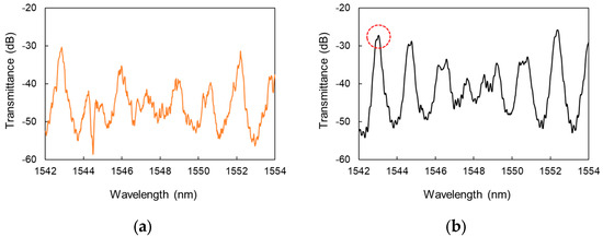 Two main resonance peaks appear in Figure 9, but there is a 5.619 dB difference in their intensities. It depicts that the resonance peaks are fully aligned and the MRRs need to be tuned. To find exactly the MRRs that need to be tuned, the spectral responses of Filter A (Input Port 1 and Output Port 4) and Filter B (Input Port 5 and Output Port 4) are measured. It can be seen from Figure 10a that there are two obvious main resonance peaks at the wavelengths of 1542.8 nm and 1552.2 nm. The main resonance peak is marked with a red dashed circle in Figure 10b, and the secondary resonance peak (next to the main resonance peak) has a larger crosstalk of −1.563 dB. Thus, Ring 3 or Ring 4 needs to be tuned to suppress the crosstalk. Figure 11 shows the spectral response of Filter B with −3 V applied to Ring 3, and the crosstalk is suppressed to −6.123 dB.