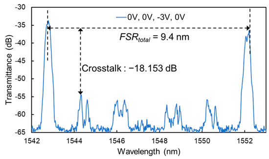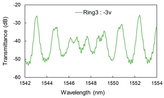 Figure 12 shows the measured drop port spectral response of the fourth-order Vernier MRR filter (light input from Port 1 and output from Port 6) when a voltage of −3 V is applied to Ring 3. The extended FSR, FSRtotal, is 9.4 nm, and the crosstalk is −18.153 dB, as illustrated in Figure 12. Manufacturing errors led to deviations between the actual round-trip lengths of the MRRs and the designed round-trip lengths. The ratio is not equal to 5 to 6, resulting in the resonance peaks of MRRs not being perfectly aligned. It causes a splitting of the main resonance peak on the right side in Figure 12, and the FSRtotal of 9.4 nm is slightly larger than the designed FSR of 9 nm. The total insertion losses for the drop port are 33.719 dB. The Q factor at the wavelength of 1542.8 nm is 8571. The fiber-to-fiber insertion loss in the process of optical performance measurement is approximately 10 dB. The propagation loss in a 2 mm long busline from the input port to the drop port is ignored. Therefore, the insertion loss of the fourth-order Vernier MRR filter is approximately 23.719 dB.