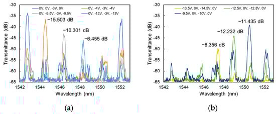 To increase the wavelength channels within one FSR, the MRRs are reverse biased to achieve discrete tuning of the main resonance peak. The main resonance peak shift is shown in Figure 13. When Rings 2 and 4 are applied voltage, the main resonance peak is red-shifted with a step of 1.8 nm, which corresponds to the FSR of Rings 1 and 3, as shown in Figure 13a. In turn, when Rings 2 and 4 are tuned, the main resonance is blue-shifted with a discrete step of 1.5 nm, which corresponds to the FSR of Rings 2 and 4. In WDM systems, a crosstalk of less than −10 dB is required to extract the desired wavelength. Unfortunately, the crosstalk of the main resonance peak is −6.455 dB at a reverse bias of −13 V on Rings 2 and 4, and the crosstalk of the resonance peak is also greater than −10 dB at a reverse bias of −13.5 V and −14.5 V on Rings 1 and 3. The reason is considered to be a manufacturing error in the thickness of each layer in the FACQW core layer during the MOCVD that causes the redshift of the absorption peak with an increase in the applied electric field.
