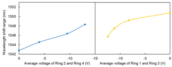 Figure 14 illustrates the wavelength shift range of the main resonance peak as a function of the average voltage applied to MRRs. Excluding the main resonance peaks with crosstalk greater than −10 dB, there are four channels within the FSR. In the right panel of Figure 14, since the reverse bias of Rings 1 and 3 is performed on the premise of Ring 3 at −3 V, the linear tuning is not presented. In the left panel of Figure 14, the discrete tuning of the main resonance peak is close to linear with respect to the applied average voltages to Rings 2 and 4.