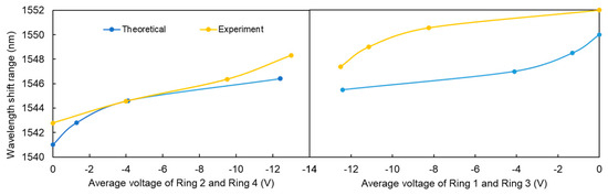 The tuning voltages of the theoretical and experimental values are shown in Figure 14. Since it is necessary to apply a voltage to Ring 3 to align the resonance peaks of Rings 1, 2, and 4, the average voltage of the main resonance peak tuning of Ring 1 and Ring 3 is greater than the theoretical tuning voltage from the right side in Figure 15. Therefore, the theoretical tuning voltage and the experimental tuning voltage are compared with the voltages of Ring 2 and Ring 4. It can be seen from Figure 15 that the experiment tuning voltage is greater than the theoretical tuning voltage in the lower applied voltage range. Its reason can be considered as the impurity density deviation in the waveguide. The electric field-induced refractive index change strongly depends on the impurity densities of the intrinsic FACQW layer and the upper cladding layers. Different impurity densities lead to a large difference in the refractive index change under the same voltage because the electric field-induced refractive index change of the designed FACQW is sensitive to the impurity density. Therefore, the deviation between the impurity density and the designed value in the wafer fabrication is the reason for the increase in the experimental tuning voltage.
