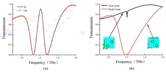 (a) Simulated transmission curve of the metamaterial biosensor under TE and TM incident waves. (b) Simulated transmission curve of the bright mode (red line) and the dark mode (black line).