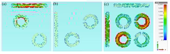 To determine the physical mechanism behind this plasmon-induced transparency (PIT), we further examined the surface current distribution of the bright mode (Figure 3a), dark mode (Figure 3b) at 1.19 THz, and the complete structure at 1.22 THz (Figure 3c). As shown in Figure 3a, when the TE wave impinged on the bright mode, it directly excited a significant enhancement of surface currents, mainly concentrated on the horizontal cut wire and the inner side of the SRRs, thus resulting in the generation of a significant transmission dip, as shown in the red curve of Figure 2b. Conversely, the vertical cut wire and the other two diagonal SRRs showed minimal response to the TE incidence; hence, it will not generate resonance, as shown in the black curve of Figure 2b. The combination of cut wires with the two sets of SRRs formed a complete metamolecule, transferring the intense enhancement of surface current entirely to the dark mode resonator through near-field coupling with the bright-mode resonator. Furthermore, conspicuous rotating surface charges appeared along the SRRs, with gaps oriented parallel to the direction of the incoming electric field, indicating the induction of a magnetic dipole on the dark mode, characterized by minimal radiative loss. The destructive interference of the dark mode’s indirect resonance intensity with the bright mode’s direct resonance intensity led to the appearance of a narrow transparent window at the frequency of 1.22 THz.