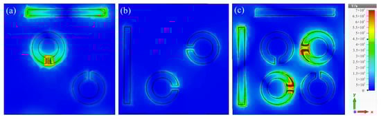Corresponding electric field distributions for the bright mode (Figure 4a) and dark mode (Figure 4b) at 1.19 THz, as well as the complete structure at 1.22 THz, are depicted. As illustrated in Figure 4a, the electric field energy was primarily concentrated at the two ends of the horizontal cut wire and the gap of the SRRs, resulting in high-intensity resonance, as observed in the bright mode (Figure 2b). Conversely, the vertical cut wire and the other two diagonal SRRs remained unexcited independently, leading to a lack of resonance. Figure 4c reveals that when the two structures were coupled, the electric field energy from the bright mode was transferred to the dark mode, with the initial electric field distribution around the bright mode concentrating on the dark mode. This finding aligns with the surface current distribution for the complete structure illustrated in Figure 3.