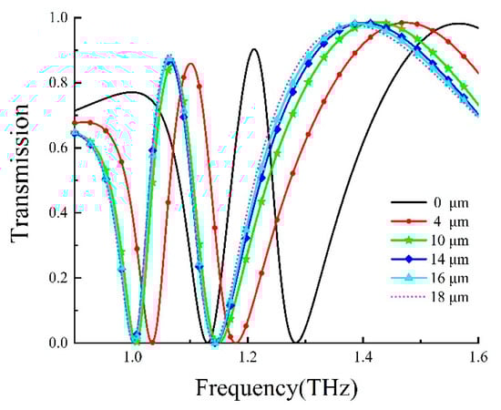 Transmission curve of the metamaterial biosensor at different analyte thicknesses.