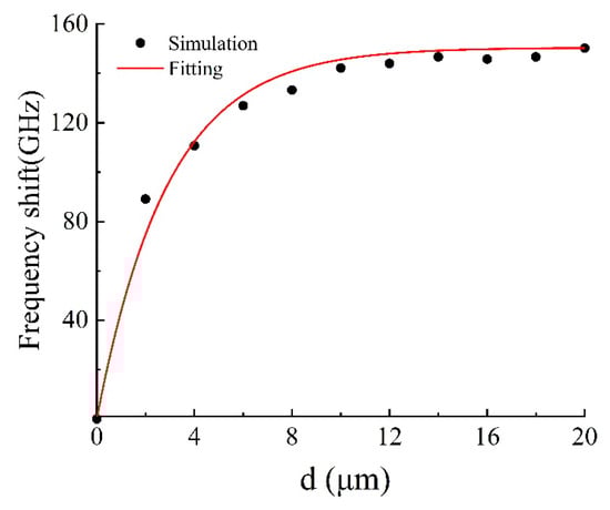 To explore the sensing properties of the DCW/QSR metamaterial, we initially analyzed the influence of analyte thickness on the proposed metamaterial biosensor through numerical simulations. Figure 5 displays the transmission spectra of the DCW/QSR metamaterial biosensor at various analyte thicknesses, ranging from 0 μm to 18 μm. The transparent peak frequency redshift (Δf) increased with growing analyte thickness. As shown in Figure 6, the red curve represents the fitting curve, with R2 = 0.9917, indicating an excellent linear relationship between frequency shift and analyte thickness. Additionally, when the analyte thickness surpassed 12 μm, the transparent peak frequency remained nearly constant. This is because excessive analyte thickness reduced the near-field coupling effect on the metamaterial structure’s surface, resulting in the saturation of a frequency shift.
