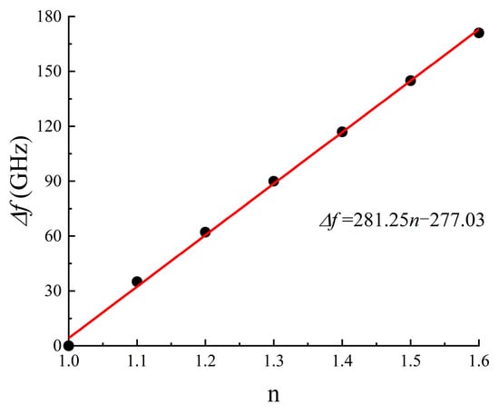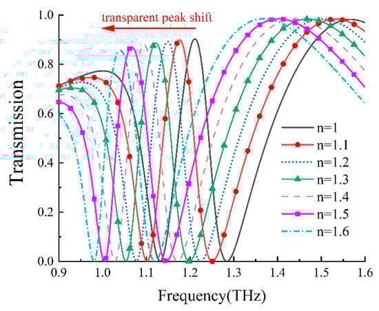 We further delved into the refractive index sensitivity of our metamaterial biosensor. The refractive index sensitivity, denoted as S [], can be typically defined as S = Δf/Δn; to characterize the sensor’s sensitivity, where Δn and Δf; represent variations in the analyte’s refractive index and resonance frequency, respectively. By altering the analyte’s refractive index from 1.0 to 1.6 while maintaining a thickness of 12 μm, we established the theoretical relationships between a transparent peak shift and the analyte’s refractive index, as presented in Figure 7. Furthermore, as shown in Figure 8, there was a linear relationship between the refractive index change and the transparent peak shift. Our findings indicate that our DCW/QSR metamaterial can provide a refractive index sensitivity of 281.25 GHz/RIU. Additionally, we compared the performance of the proposed sensor with various types of terahertz metamaterial sensors, as summarized in Table 1. The proposed sensor exhibited superior sensitivity compared to the reported sensors. Therefore, the proposed plasmon-induced transparency (PIT) metamaterial holds significant promise in applications such as bio-sensing and chemical sensing.