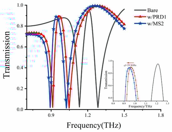 In light of the heightened demand for rapid and accurate diagnostic methods for highly pathogenic viruses like COVID-19, Middle East respiratory syndrome (MERS), and influenza A (H1N1 virus subtype), we explored alternative detection methods. Over the years, techniques like polymerase chain reaction (PCR) and branched-chain DNA (bDNA) tests, commonly used for virus detection purposes, have been plagued by issues of detection sensitivity and speed [,]. Notably, many intra/intermolecular vibration modes of biomaterials, including proteins [] and nucleic acids [], fall within the THz spectral range. This has spurred considerable interest in utilizing THz sensing technology for biomaterials. Consequently, we focused on the biosensing capabilities of our proposed DCW/QSR biosensor for a range of viruses. Specifically, we explored the use of our metamaterial sensors for detecting bacteriophage viruses, namely MS2 (30 nm) and PRD1 (60 nm), representing single-strand RNA and double-stranded DNA viruses, respectively. The dielectric constants of bacteriophage viruses can be measured by creating a thick and dense virus layer []. At 1.0 THz, the dielectric constants of PRD1 and MS2 viruses were found to be 3.57 and 3.92, respectively []. Therefore, we established a virus analysis layer with a thickness of 12 μm and the dielectric constant values of the respective viruses to assess the potential of our sensor to detect different bacteriophage viruses. The corresponding simulation results are presented in Figure 9, where a significant redshift of the PIT transparent peak can be observed towards lower frequencies. Additionally, as shown in the inset of Figure 8, the MS2 virus, with a higher dielectric constant, exhibited a resonant redshift of 25.3 GHz compared to PRD1. This biosensing detection method holds promise for the cost-effective label-free detection and identification of viruses.