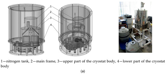 Nitrogen optical cryostat: (a) 3D model and photograph of the general view of the cryostat; (b) general view of the cryostated IR spectrometer; (c) photographs of the elements of a cooled IR spectrometer.
