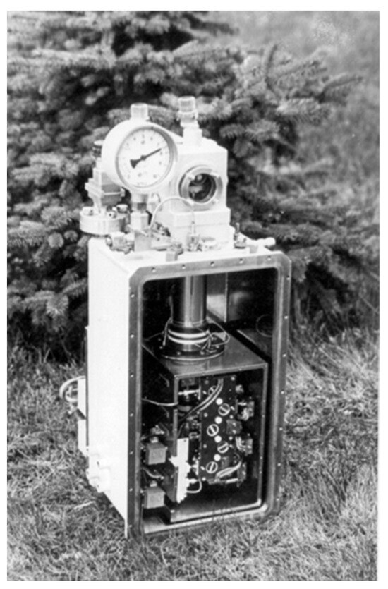 At the end of the 70 s, on the initiative of D.V. Korolkov, with the participation of the collaboration of SAO RAS, IAP RAS, and Saturn Research Institute (Kiev), a cryogenic radiometer of the 4 mm wavelength range with a cooled Schottky diode mixer and an intermediate-frequency parametric amplifier was fabricated [26]. The cryostat was made of thick (10–12 mm) stainless steel and was cooled by a Gifford–McMahon refrigerator at a hydrogen temperature level (~12 K); see Figure 6. It demonstrated excellent performance at that time, but the untimely death of D.V. Korolkov prevented it from being installed on RATAN-600. At the same time, the demand for such an instrument was high, and after small modifications, first as a 4 mm and then a 3 mm device, it was used for radioastronomical observations on the RT-22 KrAO radio telescope [25,26]. The complexity and necessity of periodic tuning of the parametric amplifier and the progress in the development of HEMT (high electron mobility transistor) [32] amplifier technologies soon led to the replacement of PA with HEMT [33], and for a long time determined the architecture of the radio receiver for astronomy up to short-mm or sub-THz waves. At this stage, the world leader in the development of cryogenic receivers for astronomy was Virginia Diodes. In Europe, such receivers were successfully developed by Antti Raisanen [34,35]. This ideology and the components of these SAO receivers were actively, and for a long time, used for other telescopes and applications before the era of superconducting receivers [36] in the sub-THz range began to dominate.