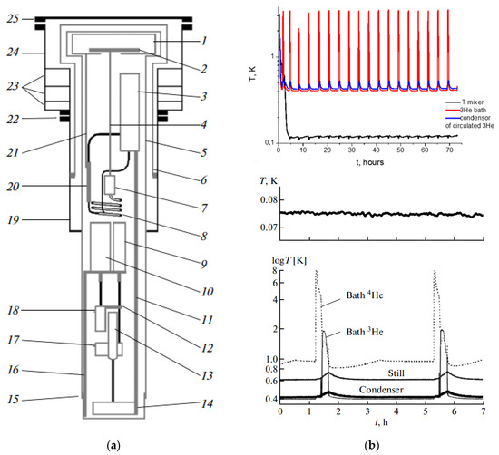 - Chernikov, A.N.; Trofimov, V.N. Helium-3 adsorption refrigerator cooled with a closed-cycle cryocooler. J. Surf. Investigation. X-ray Synchrotron Neutron Tech. 2014, 8, 956–960. [Google Scholar] [CrossRef]