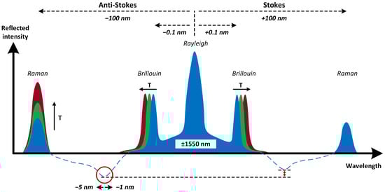 Sketch of a graph showing the approximate shape of the reflected noise of the classical channel in the band at approximately 1550 nm. In the middle is the central wavelength to which Rayleigh scattering corresponds. Then, at a distance of approximately 0.1 nm is the Brillouin scattering, and at a distance of 100 nm is the Raman scattering (both temperature dependent). In terms of noise, it is best to place the quantum channel in the anti-Stokes region 1 to 5 nm from the classical channel (red circle). Alternatively, a similar area might be used in the Stokes region.