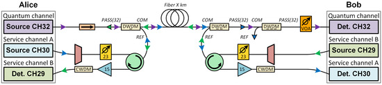 The presented scheme combines the quantum channel in one fiber with both of the service channels. The CH30 works in the same direction as the quantum channel, i.e., is transmitted from Alice toward Bob, and the direction of the second service channel is the opposite. To properly filter out noise from the quantum channel, it is necessary not only to properly filter out extraneous wavelengths, but also to ensure that noise in the area of CH32 does not reach the shared fiber. Such noise would subsequently no longer be distinguishable from the quantum channel.