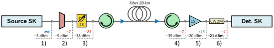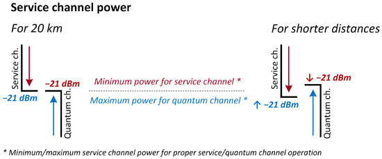 Although the sensitivity of the used SFP detectors is approximately −24 dBm, the transmitted signal is so damaged by the strong attenuation and subsequent amplification that the system needs to deliver at least −21 dBm for proper operation. Based on the above and Figure 8, it appears that this is coincidentally the same power obtained with the minimum attenuation needed for the quantum channel to operate. This issue is explained in Figure 8.