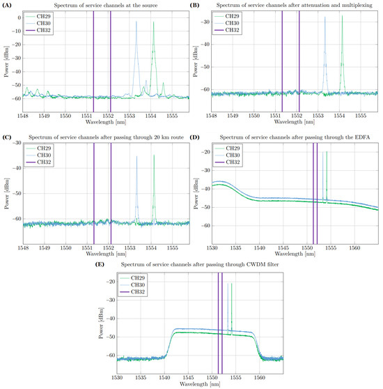 As shown in Figure 7C, after passing through the shared path and the circulators (total attenuation of approximately 7 dB), the power of both service channels is much lower (−35 dBm) than the sensitivity of the SFP modules used (−24 dBm). For this reason, an EDFA is added on each side.