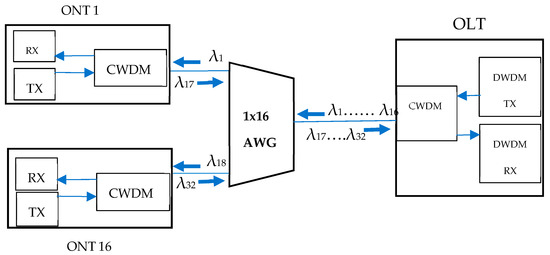 Arrayed waveguide gratings (AWGs) do not require DWDM filters on each ONT, as shown in Figure 2. However, conceptually, using AWG outside of the plant comes with a host of issues. Since AWG is extremely sensitive to temperature variations, channel spacing is severely constrained. Furthermore, it is important to tune the DWDM source and keep an eye on the AWG path band’s wavelength [13]. In order to create several WDM-based lightweight tree PONs on the same physical fiber, aggregated downstream traffic modulated at different wavelengths from the OLT is transmitted to the NxN AWG and the wavelengths are decompressed to its respective output ports. All ONUs in the light tree receive the wavelength from the AWG output port via broadcast using a 1 × N optical divider. The ONU is then set to a particular fiber wavelength. By making use of the AWG FSR, an endless number of wavelengths can be transported from a certain input port to a particular output port. Service providers have the freedom to launch new services with little to no impact on their existing legacy systems thanks to the presence of many light trees in the same physical fiber link. Future scaling will be endless due to the physical PON’s ability to support an infinite number of wavelengths. Furthermore, it utilizes passive NxN AWG and takes advantage of wavelength cycle routing made feasible by the device’s free spectral range (FSR) at 2.5 Gbps. The unique characteristic of WDM-PON is the foundation for the suggested architecture, which includes the potential to simultaneously provide switch and broadcast services as well as additional benefits in terms of signal privacy, vulnerable location, and live capacity enhancement. It may also be possible to provide various types of services on physical networks. Optical transmission experiments reveal error-free transmission has been achieved using a 25 km passive optical link with 16 × 16 AWG and a 1 × 32 divider added, despite the additional AWG in the network having an additional 5 dB power penalty [14].