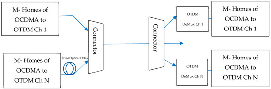 The proposed 10G-TDM-OCDMA-PON hybrid system is based on the PON code interleaving TDM and 2D-MD (P/W) bits for the OCDMA stage. A downstream FTTH network of 16 houses and 4 high-speed TDM channels is simulated. In the OLT, the time division multiplexer for channel N has N number of users, where each time slot will be assigned to a particular ONU, the same multiplexer will be used with all TDM groups, and the only difference between them is the OCDMA encoder, where each TDM group has a different OCDMA code with different uses of wavelength and polarization. The TDM signal will modulate through a light wave encoded by the MZM, and then the modulated signal is grouped together by a power combine. On the receiver side, a power divider and a polarization reducer have been used to separate the polarized living signal. FBG is used as a diffusion compensator and OCDMA decoder to pass only the light signal assigned to a specific OTDMA group. A power divider is used to split the light signal for all the houses and then an optical time division demultiplexer is placed inside each ONU to recover the information sent to this ONU [16].