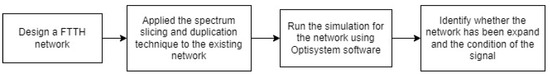 The flowchart below (see Figure 5) shows how the simulation or the network works after the spectrum slicing and duplication technique is applied. This is to analyze the network scaling. In this study, the simulation for the upscaling was implemented using Optisystem software. To achieve the objective of the study, we changed the network by adding the AWG, power splitter, WDM Demux and power splitter. Using the new arrangement of the network, we collected the raw data of the signal going through the network, such as the maximum number of users, Q factor and bit error rate (BER).