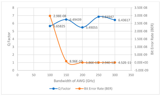 Tests were conducted to identify the appropriate bandwidth for the network. The bandwidths studied ranged from 100 GHz to 300 GHz. The following are the results of the Q factor and the bit error rate for each bandwidth. The AWG bandwidth is changed while the power and number of output ports (separation ratio) are the same, which are 0 dBm and 6 × 32 × 32 × 32 (196,608 users). From the data and graphs that have been plotted (Figure 7), it can be seen that the greater the bandwidth, the better the Q factor and the bit error rate (BER) value. This is because when the bandwidth is increased, the signal carried is high, making the final signal that reaches the user good, even if it has been sliced and duplicated. This theory can be described as the size of the pipe and the water that passes through it; when the size of the pipe is large, more water can pass through the pipe. Just like the analogy, the larger the bandwidth, the more signals or data that can pass through and can be transmitted at one time.