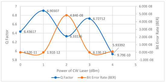 After studying the user group as well as obtaining the appropriate bandwidth, a test was conducted to investigate the appropriate power for the network. The power studied ranged from 0 dBm to 4 dBm. The following are the results of the Q factor and the bit error rate for each power. The power is changed while the bandwidth and number of output ports are the same, which are 300 GHz and 6 × 32 × 32 × 32 (196,608 users). From Figure 8 that has been plotted, it can be seen that the more the power increases from 0 dBm to 4 dBm, the lower the value of the Q factor and the value of the bit error rate (BER). This is because when the optical power is too high, the ‘gain coefficient’ will decrease, which, in turn, will reduce the power of the signal. More precisely, when the optical power exceeds the saturation of the optical power (saturation optical power), the ‘gain’ will be saturated (saturated). This is related to the ‘gain saturation’ in EDFA, so the appropriate power for this network that uses EDFA is 0 dBm.