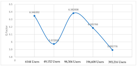 Table 1 shows the Q factor versus the number of users at different bandwidths, from 100 GHz to 300 GHz. It seems that 196,608 users always fulfil the minimum allowable Q factor (≥6). The average Q factor is 6.185766 (no. of users = 196,608), as compared to 5.892776 (no. of users = 393,216). Figure 10 depicts the average Q factors at different numbers of users. We can conclude the maximum number of users for this configuration (6 × 32 × 32 × 32) is 196,608. The Q factor for the user number (equal to 393,216) is less than 6; therefore, it cannot be considered for effective communication.