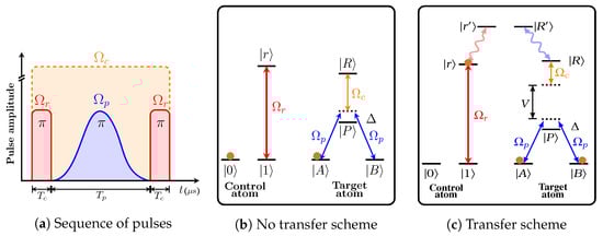 In our simulations, we choose the maximum value of the Raman pulse and the detuning . The Raman pulse is applied for a duration . Also, we adopted an approach of a non-Hermitian Hamiltonian to consider the finite lifetime of Rydberg state of control atom by adding the term to Equation (3) and the finite lifetime of the intermediate states of target atoms by adding the term to Equation (5) where and are the decay rates of Rydberg and intermediate excited states, respectively.