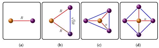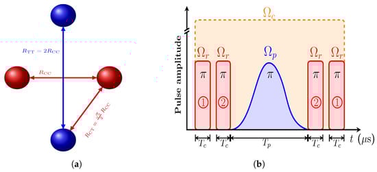 Müller et al. [] analyzed the effect of target-target interactions in the three-qubit GHZ state for three target atoms while considering the control-target interaction to be constant and varying the target-target interaction. This two-dimensional configuration is not relevant to the typical experimental conditions, since changing the values of the target-target interaction requires varying the interatomic distance between target atoms, which also results in change of the distance between the control and target atoms in all possible spatial configurations of atomic ensembles. In our following simulations, we varied the interatomic distances for several spatial configurations, which are illustrated in Figure 3. In Appendix A, we developed an analogous model for the one described in this section, where the coupling between many Rydberg states in considered.