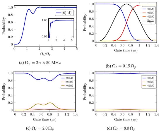 Following the original work [], in Figure 4 we illustrate the dependence of the probability of blocking the population transfer as a function of the ratio between and . In this case, the control atom is not excited to Rydberg state. Therefore, there is no interaction between control and target atoms. As clearly seen in Figure 4a, for in the EIT regime [] the transfer between ground states of the target atom is blocked. The time dependence of the population transfer is shown in Figure 4b–d. At low value of the population transfer becomes allowed [Figure 4b]. In the intermediate case of relatively small , the state is temporarily depopulated, but finally the system returns to the initial state [see Figure 4c]. At very high values the system mostly remains in the state [see Figure 4d]. Although the regime of strong coupling is advantageous for maximum gate probability transfer, it requires high coupling Rabi frequencies of order of hundreds of MHz or GHz which are difficult to achieve experimentally for highly excited Rydberg states due to the drop of transition matrix elements for ground-Rydberg laser excitation as . Therefore, the intermediate values of are of interest for experimental implementation. Similar behavior of probability transfer is observed for larger number of target atoms.