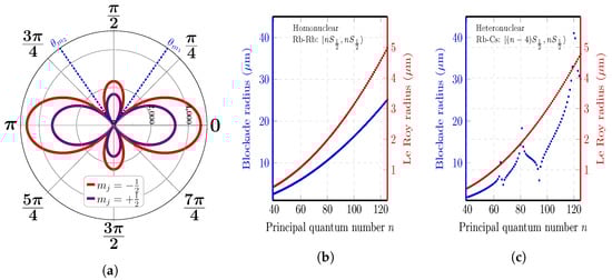 In Figure 5b,c, we show the evolution of blockade radius (dotted-blue curve) and Le Roy radius (dotted-red curve) as a function of the principal quantum number n of the excited Rydberg state for homonuclear interaction between two Rb atoms excited symmetrically to Rydberg states and the heteronuclear interaction between Rb and Cs atom excited asymmetrically to Rydberg states , and , respectively. It is noted that for homonuclear interactions with symmetric Rydberg states, the evolution of blockade radius is steady while being fluctuant for the asymmetric heteronuclear (or homonuclear) interactions. For Rb atom excited to Rydberg state interacting with Cs atom excited to Rydberg state , the value of blockade radius reaches local maxima. Local maxima points are repeated also at , and 122 (the principal quantum number corresponding to the Rydberg state of Cs atom). Local minima points (, and 94) can be imputed to principal quantum numbers where the dipole-dipole couplings of these pair states counteract each other. The evolution of Le Roy radius is steady in both cases.