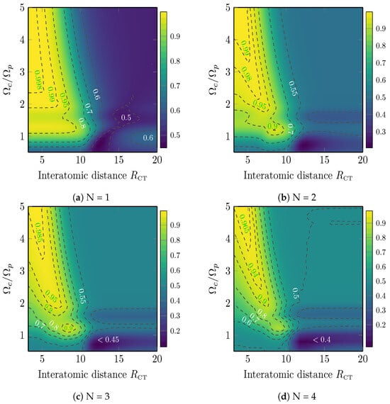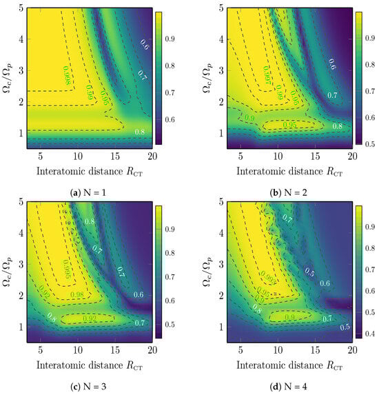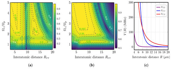 In Figure 9a,b, we plot the contours of fidelity when the system is initially prepared in the superposition of ground states on control atoms, while the target atoms are in states : with gate duration of . The total number of computational basis states for a scheme with k control atoms interacting with N target atoms is equal to . In Figure 9a, we consider all possible interaction between control and target atoms. The maximum achieved fidelity is for a high value of Rabi frequency for . It is also noticed a sharp drop in fidelity for which can be a result of the interaction between control atoms, since in this regime interaction between target atoms almost vanishes as seen in Figure 9c. In Figure 9b, we study a non-realistic case where we neglected the interaction between control atoms, which can be compared with the case of CNOT in Figure 7b, considering the different spatial arrangements. The maximum value of fidelity becomes possible for a wider range of intratomic distances. This case proves that the destructive pattern in system dynamics is a direct result of .