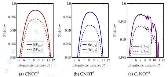 CNOT—In Figure 10a,b, we plot the fidelity as a function of interatomic distance between Cs control and Rb target atoms for CNOT gate for , and , respectively, with , , and total gate time . Solid (dashed) curve represents the case of excitation of the target atoms through the second (first) resonance level of the intermediate state (). It is clear that using the second resonance level enhanced the obtained fidelity for CNOT (CNOT) to be () at , compared with () for excitation through the first resonance level.